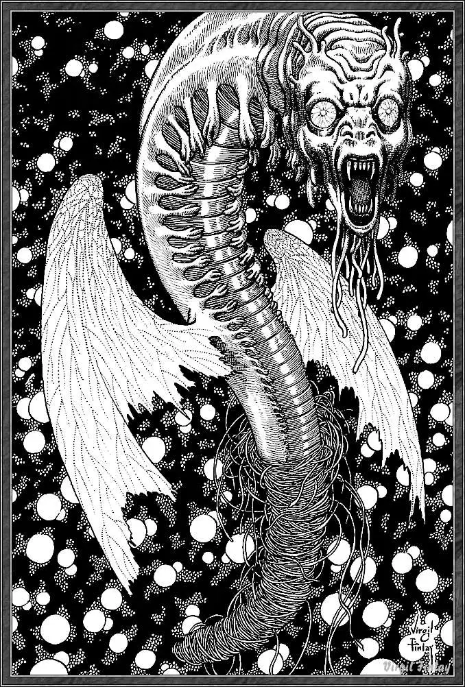 The Science Fiction Hall of Fame inducted Finlay in 2012. Belated Virgil Finlay has many posters of their gigs with H. P. Lovecraft, Elric, Weird Tales, back cover “Black Butterflies” from Spirits 2 (snake/caterpillar with wings) and other publication from 1949, etc, and derived to Uriah Heep‘s first cover and Falcon.