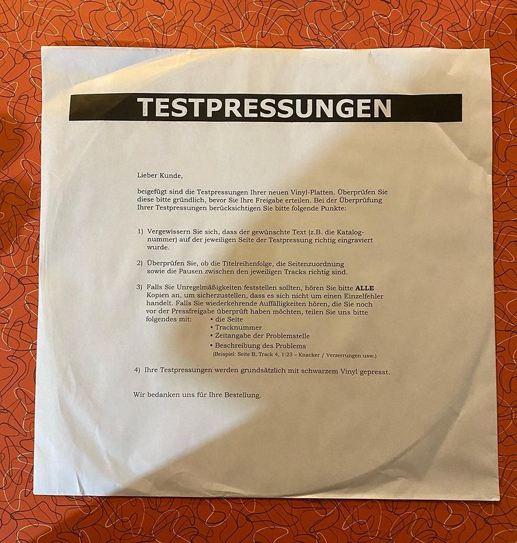 beigefรผgt sind die Testpressungen Ihrer neuen Vinyl-Platten. รœberprรผfen Sie diese bitte grรผndlich, bevor Sie Ihre Freigabe erteilen. Bei der รœberprรผfung Ihrer Testpressungen berรผcksichtigen Sie bitte folgende Punkte:
