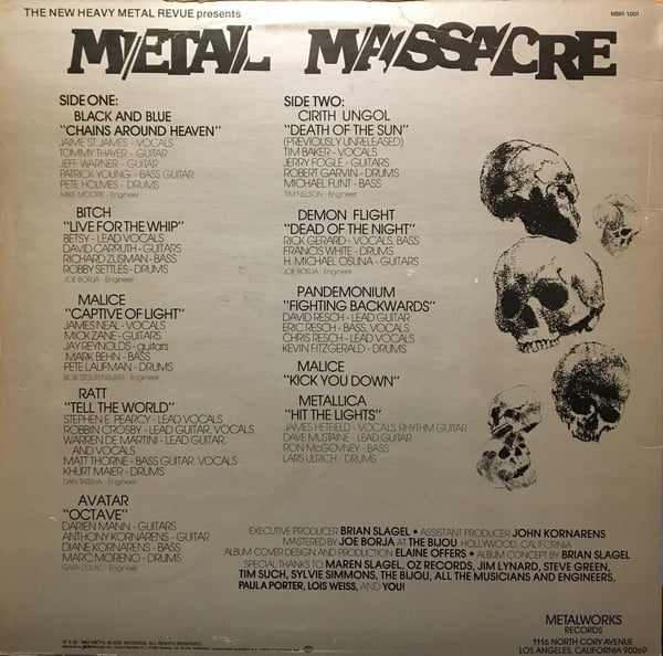 ID 20575 โบ๏ธ Edition LP: (Metalworks Records – MBR 1001) [second pressing] ๐ŸŒŽ Country United States of America (USA) (US) ๐Ÿ’ฟ RecordMetal Massacre 1 โš”๏ธ Band Various artistsRelease date Mon 14 Jun 1982 • Published (unknown date) Jul 1982 • Release label Metalworks Records • Release number MBR 1001
