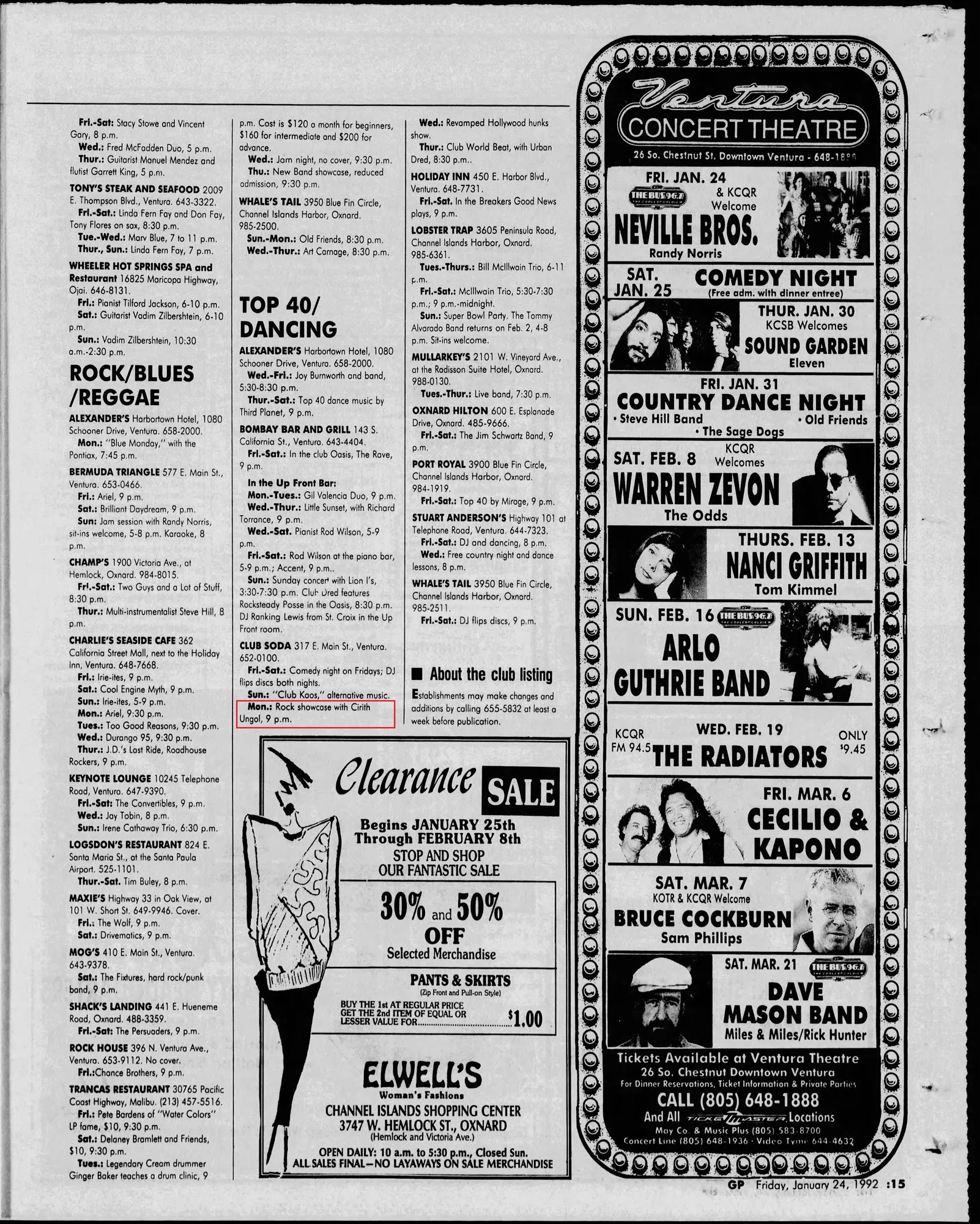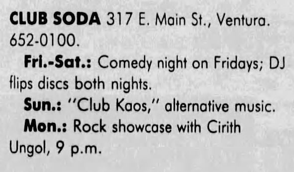 Curious: What date is this? Either is was Mon 13 Jan 1992, Mon 20 Jan 1992, Mon 27 Jan 1992 or Mon 03 Jan 1992. Is it one gig (newspaper Ventura County 24 Jan 1992 and 31 Jan 1992), or two gigs? When is it two gigs, what date on addition? What is the lineup then? And has this been canceled? What is the exactly address? Were there other bands there? What is the setlist for all of the bands? What are the members then? Do you have photos, music or video that we can see or hear? Any more fun facts at that time?