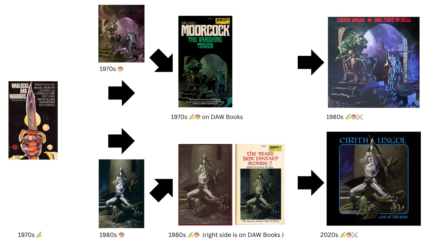 Not related on CU, but see The Year’s Best Fantasy Stories: 2, on DAW Books from Aug 1976 and the compilation album cover of DragonSlayer/Slayer (2008, re-released from 1980’s) was released after.