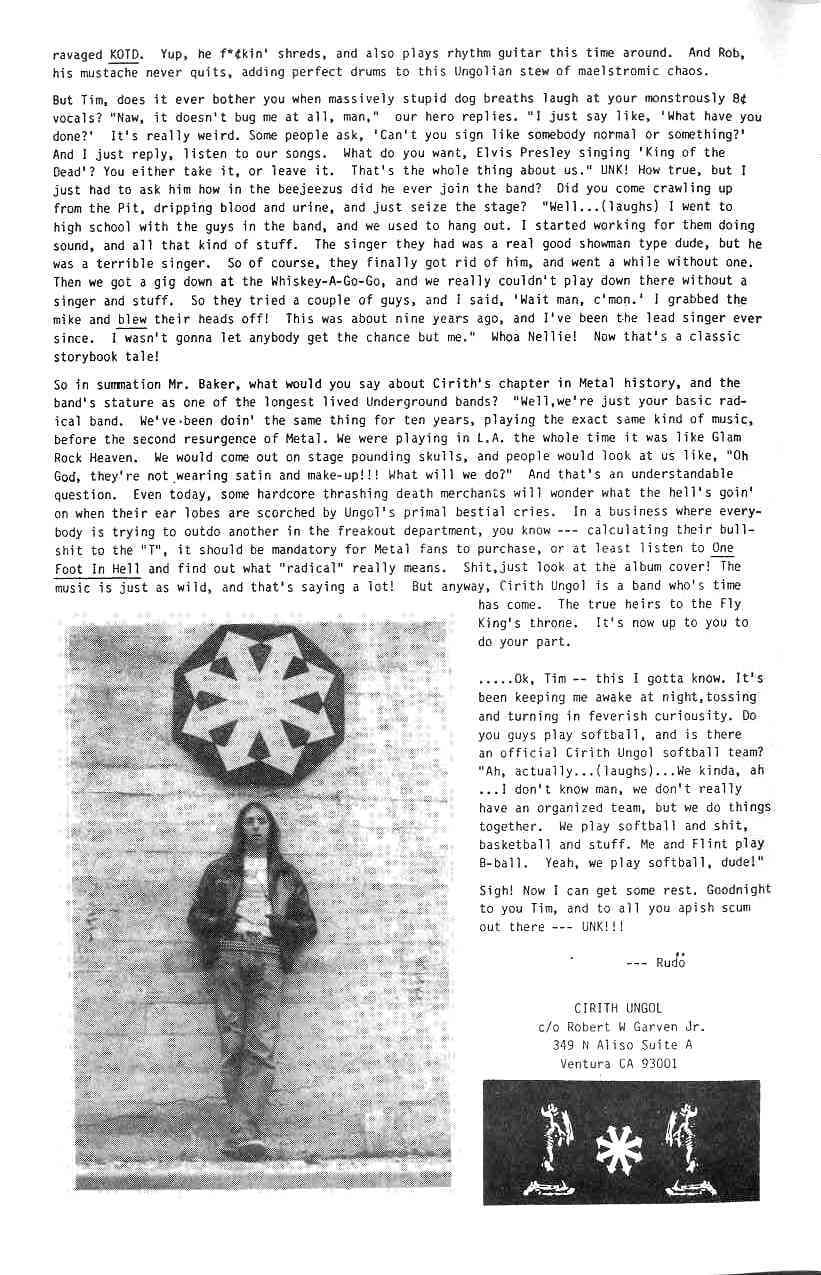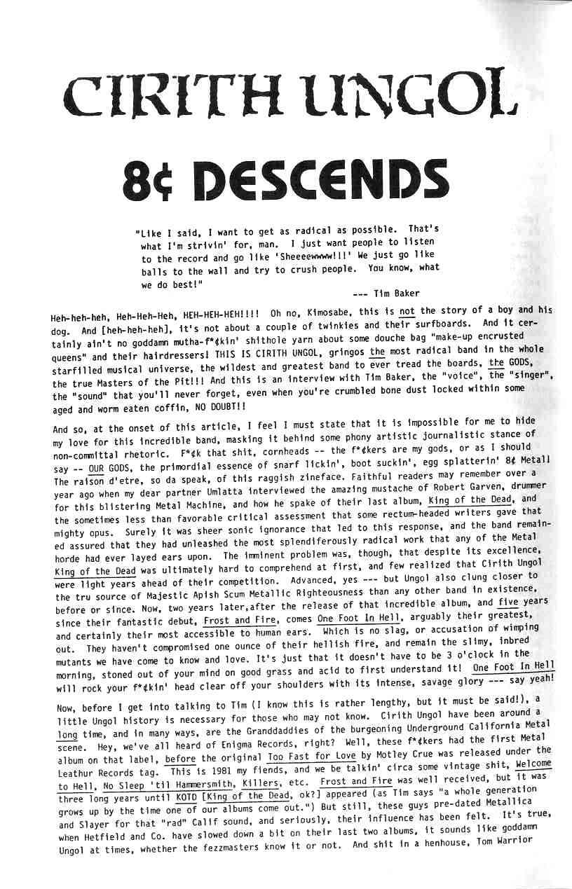 As I mentioned in my blog profile, I used to be a co-editor of an 80’s Metal fanzine, the 8 cent “Suck City.” Our modus operandi back then was to be known as “The Mag that Worshiped Cirith Ungol!” We worked hard at it, running numerous interviews, reviews, and the like. Below is a scan of an interview I did with the most resplendent and 8 cents singer of all-time, the AMAZING TIM BAKER! This was done back in 1986, when their “One Foot In Hell” opus was brand new.