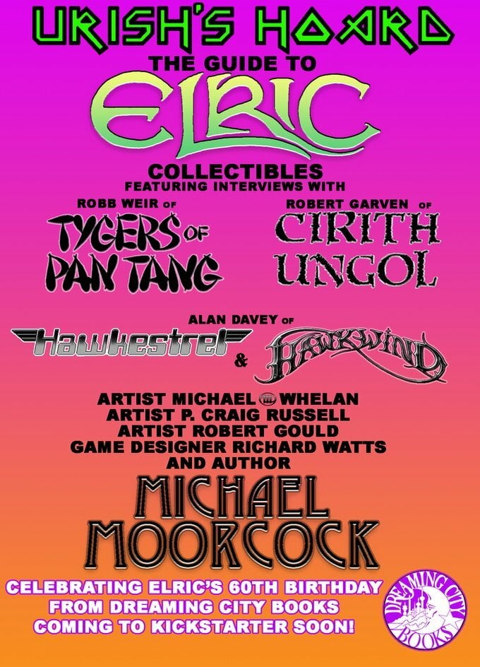 To celebrate I’m offering Urish’s Hoard at a birthday discount if any of you may have missed it. It’s an Elric celebration in book form with 100s of photos, interviews with Moorcock, Michael Whelan, Robert Gould, P. Craig Russell, members of Hawkwind, Cirith Ungol, Tygers of Pan Tang, and articles about the rpgs, art, comics etc. The link will be in a comment below.