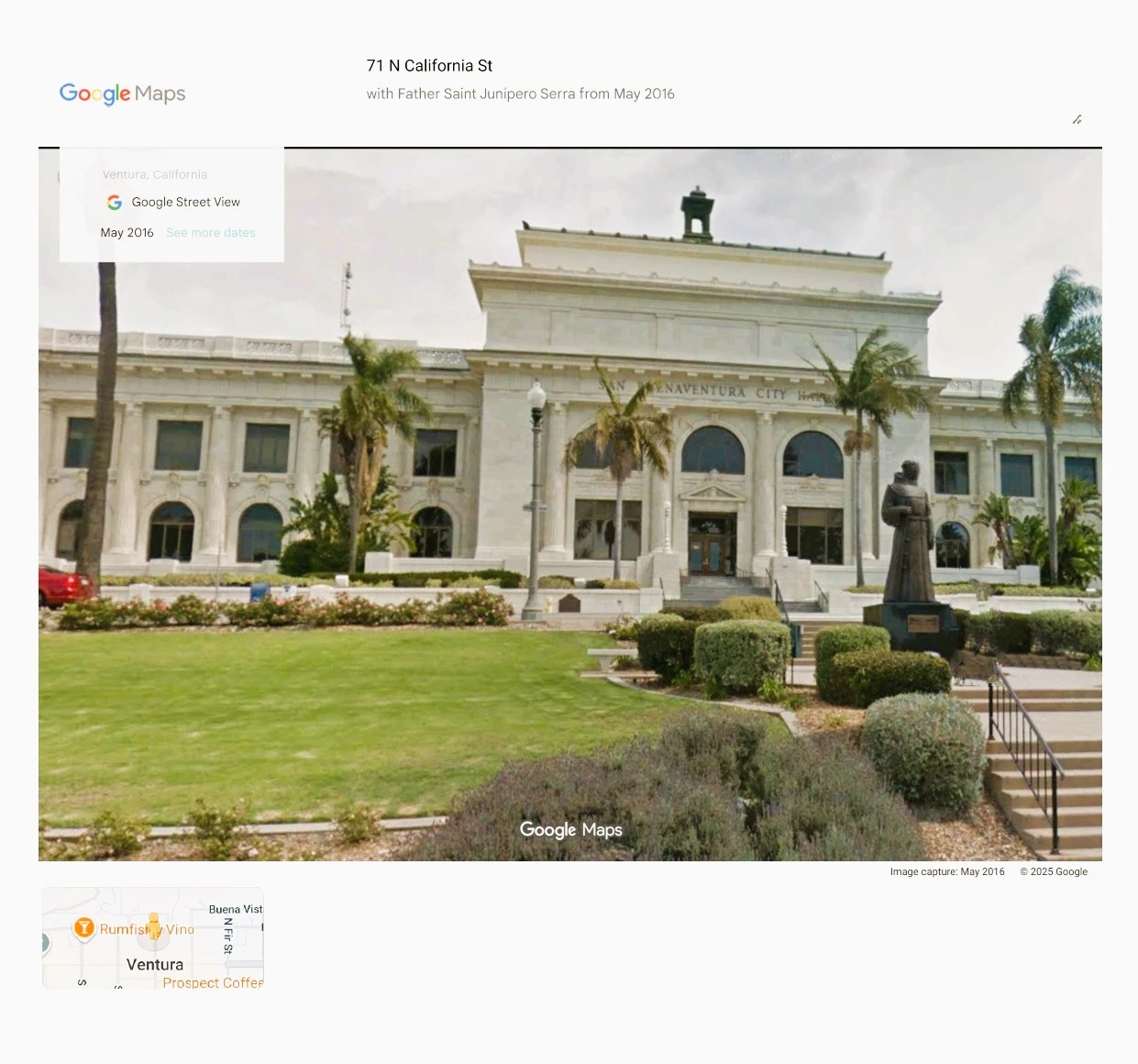 - Ventura City Hall without statue of Father Saint Junรญpero Serra from 2025