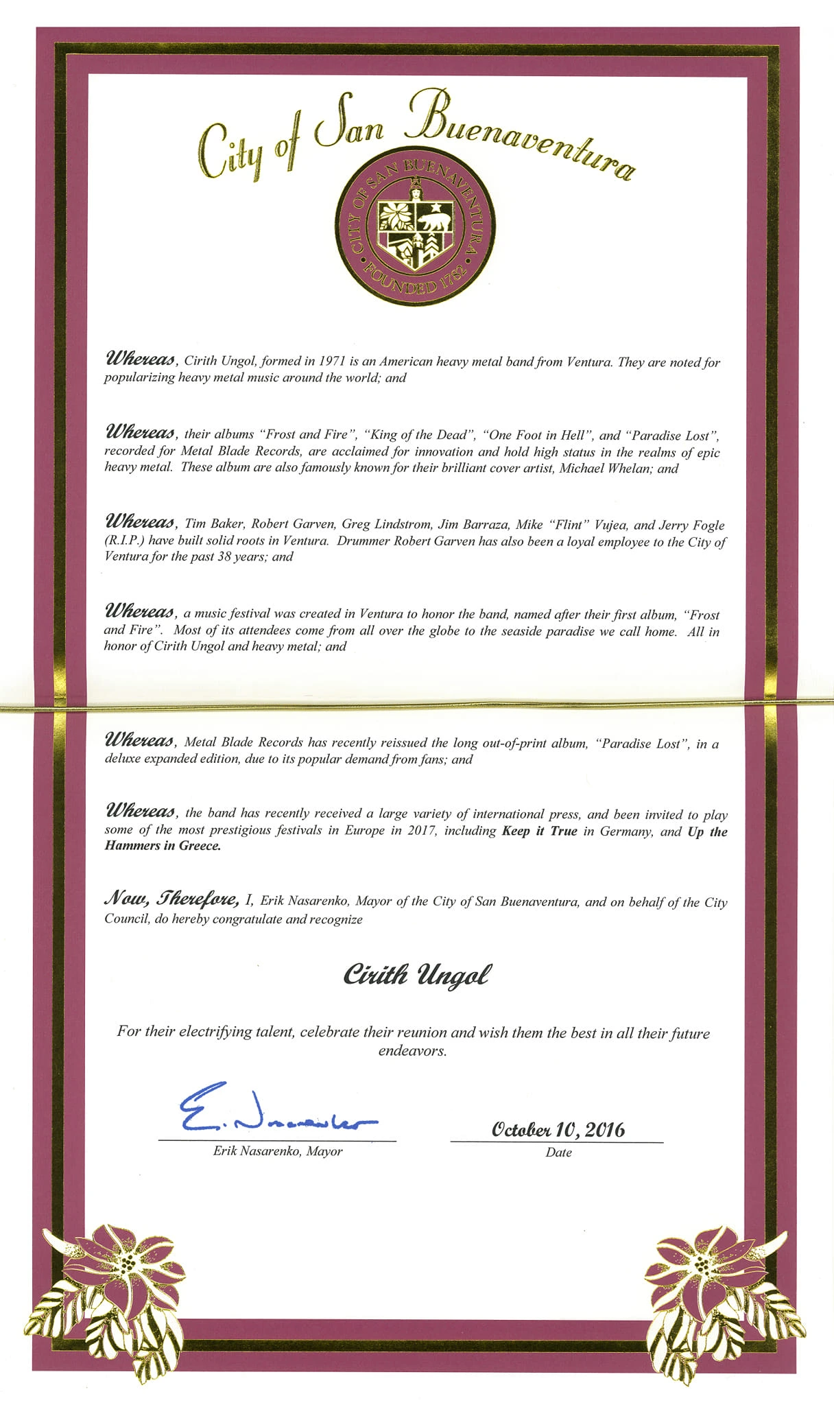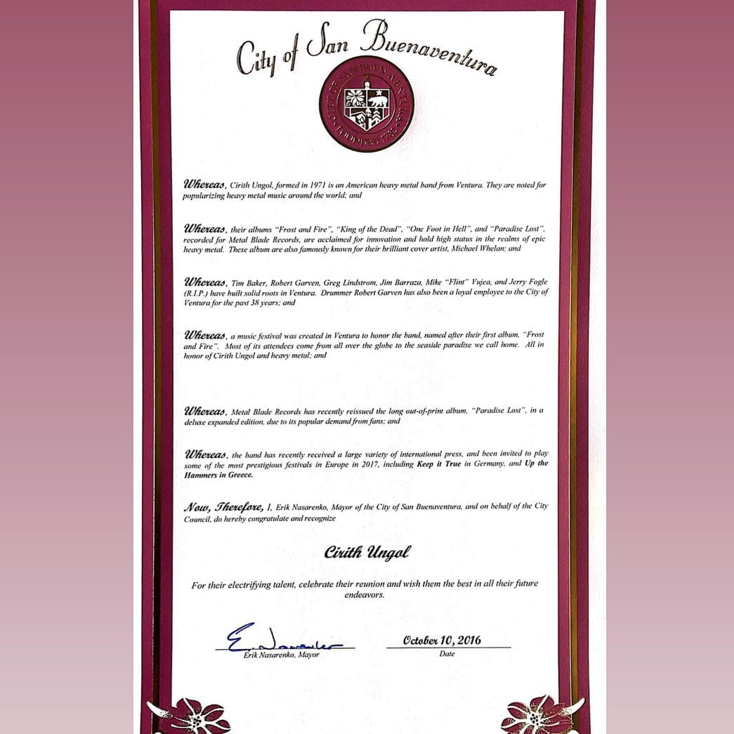 Was given out by the City of Ventura, California – commemorating Cirith Ungol’s contributions to the music scene.