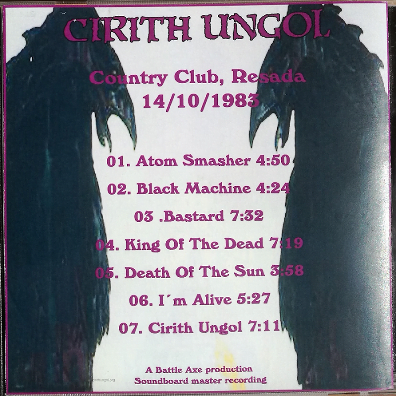 Sometimes sold by whisperer in the darkness at eBay. Description is: “A simply fantastic item containing a รผber rare recording with the band from the Country Club, Resada 14/10/1983, which according toย many was at their absolute musical peak! Sound quality is enjoyable and the tracklist is simply fantastic! The recording is from the gap between Frost & Fire and King Of The Dead, so the band plays some of their most treasured songs from their earliest era. The set is just fantastic and Tims vocals are nothing but killer! This one is a absolute must for Cirith Ungol fans or anyone into early US heavy metal!”