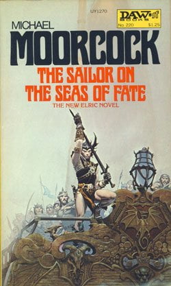 (Michael Moorcockย created fantasy character Elric of Melnibonรฉ is featured in The Elric Saga 2, published by DAW Books – but not credited). The Sailor on the Seas of Fate (Elric 2) follows Elric as he embarks on a journey across magical seas with his companion, the pirate Hawkmoon. Together, they face strange worlds, mythical creatures, and cosmic forces. Elric struggles with the burden of his destiny and the power of his sword, Stormbringer. The novel explores themes of fate, chaos, and the conflict between law and disorder.